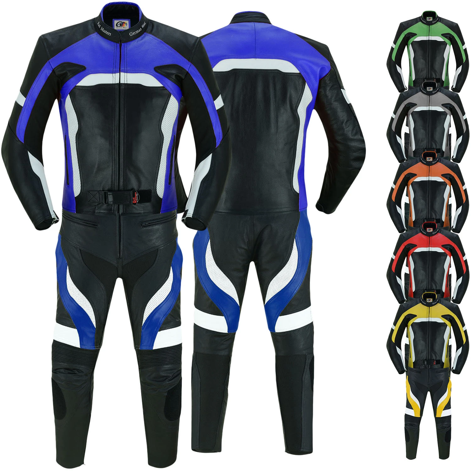 2-Teiler Motorradkombi aus Rindsleder , kombigeeignet, Farbe: Grün / Gelb / Blau /Orange