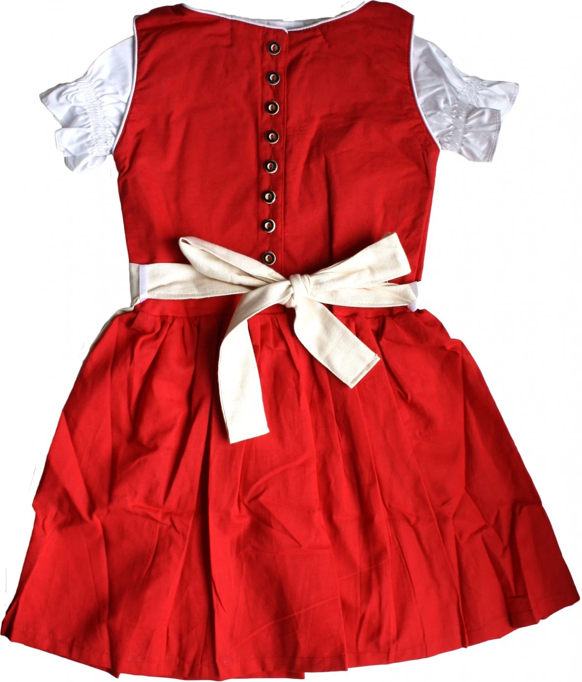 - Das Kleid an sich ist signalrot und wird hinten mithilfe von Knöpfen im Trachtenlook geschlossen