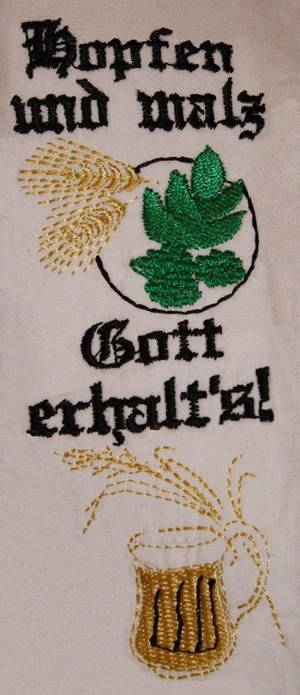 - Auf dem Stoffstreifen wurde eine attraktive Stickerei aufgebracht „Hopfen und Malz, Gott erhalt’s“