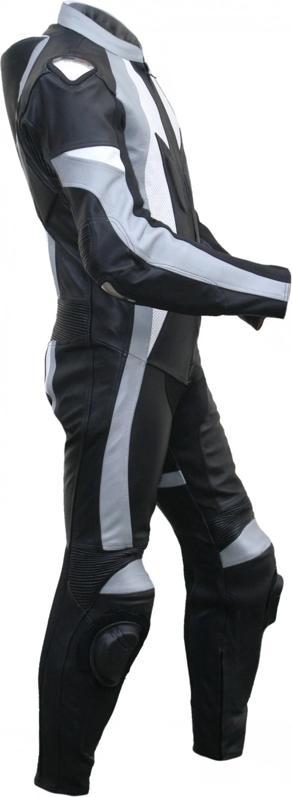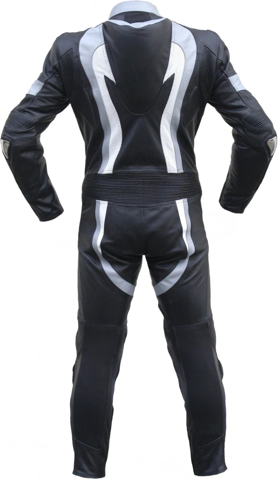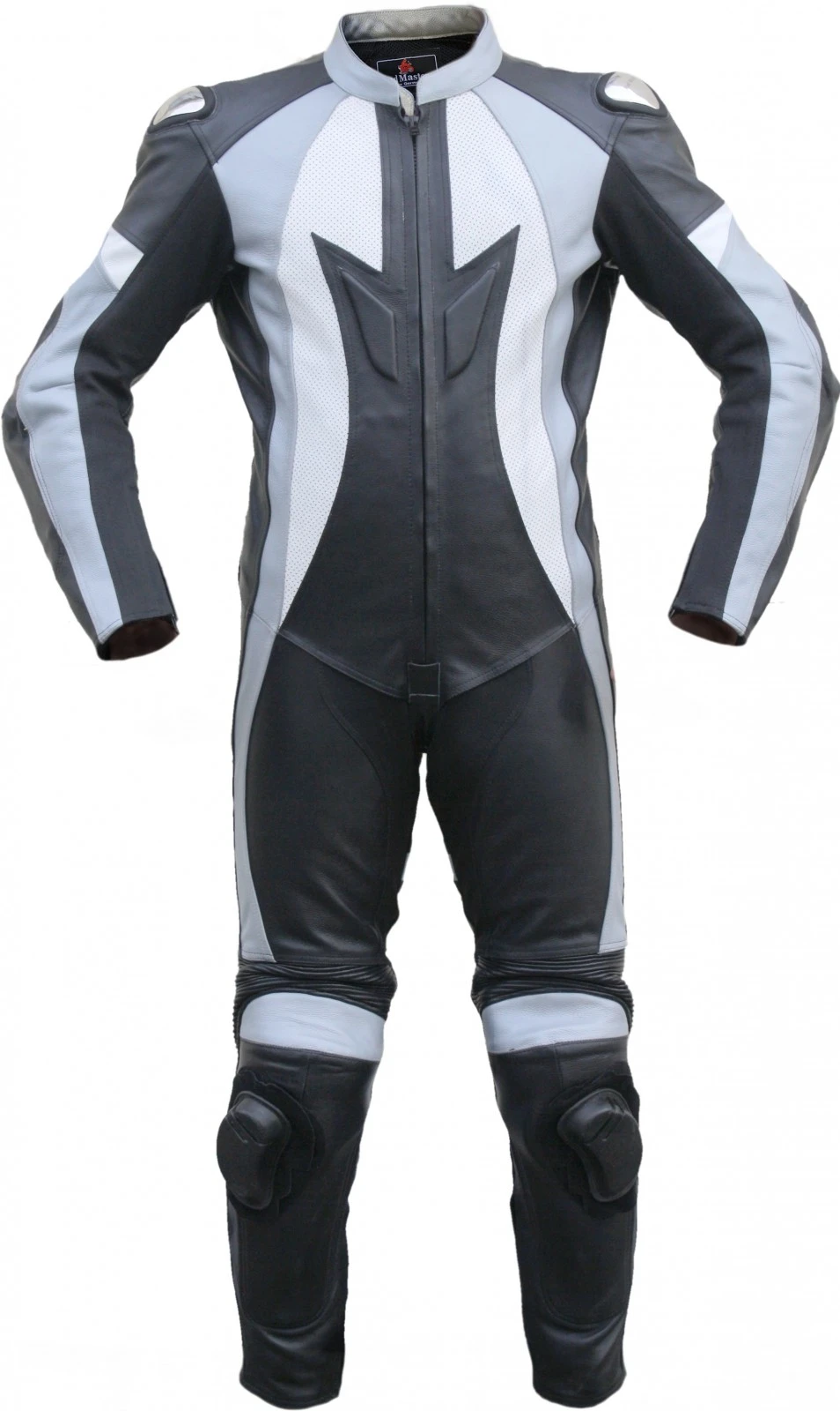 Motorradkombi aus Rindsleder mit Rückenhöcker, atmungsaktiv, Farbe: Schwarz & Grau/Weiß