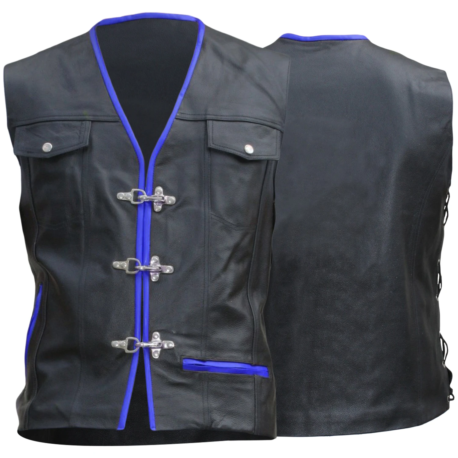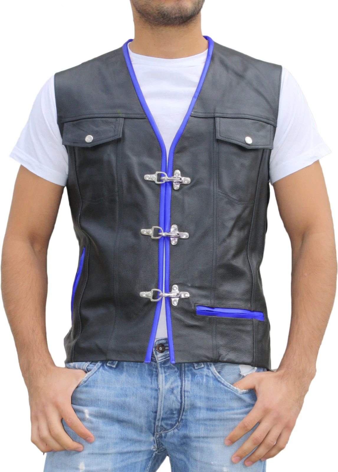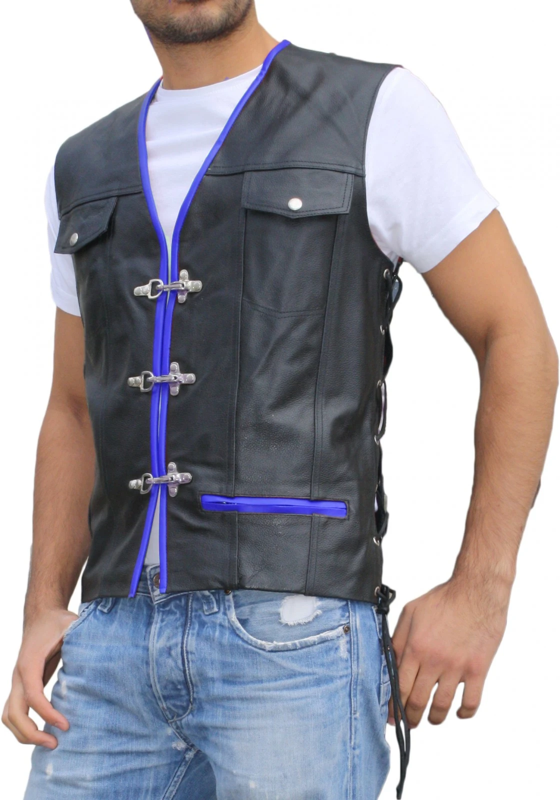 Motorrad Lederweste Aus Echtem Rindsleder, Schwarz / Blau