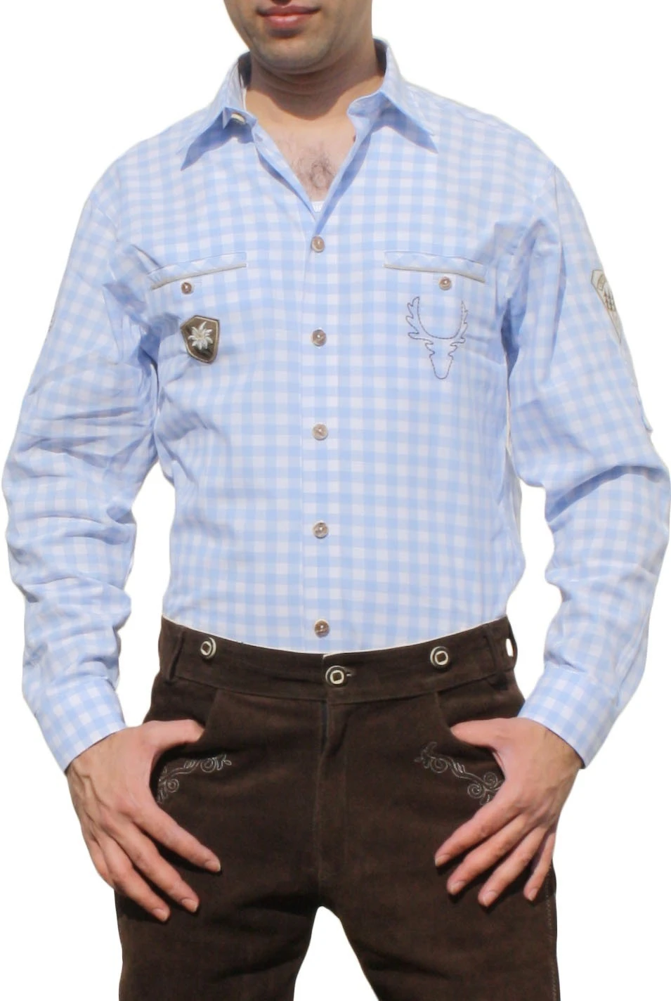 Trachtenhemd für Lederhosen mit Verzierung aus 100% Baumwolle, Farbe: Blau/Kariert