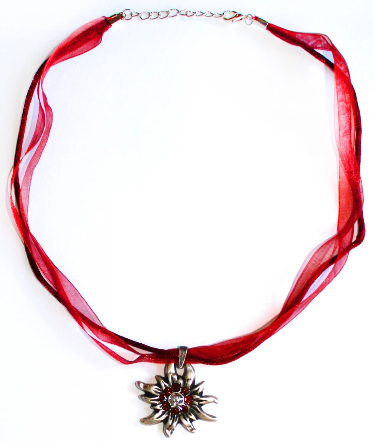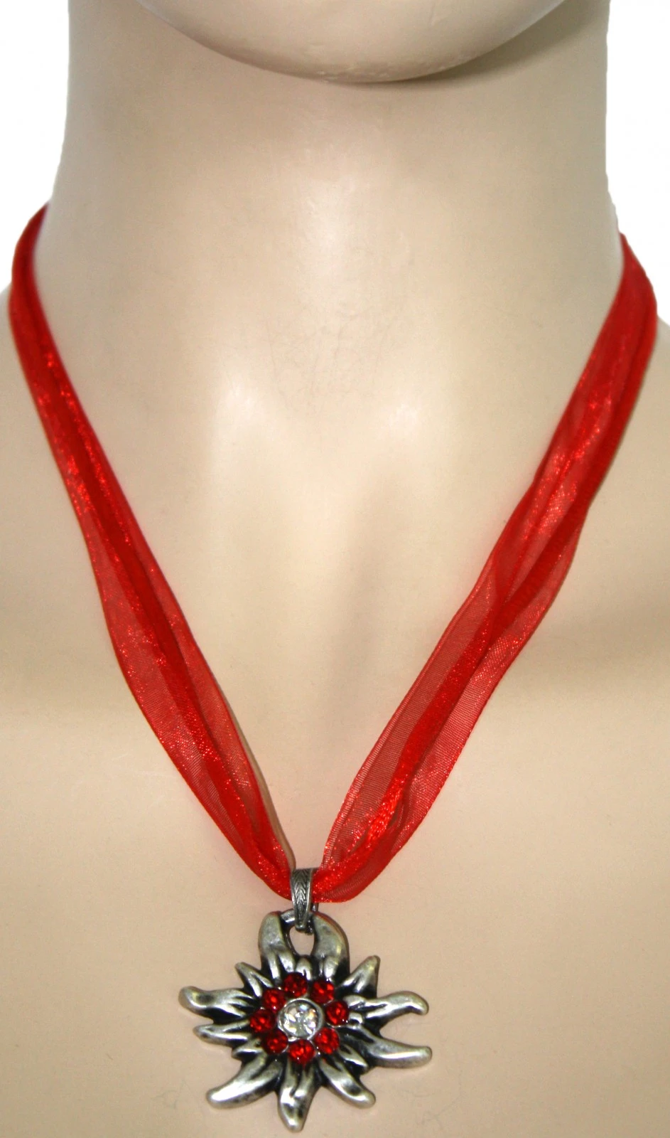 Trachtenkette aus Satin/Chiffon mit Strasssteinchen besetzem Edelweißanhänger