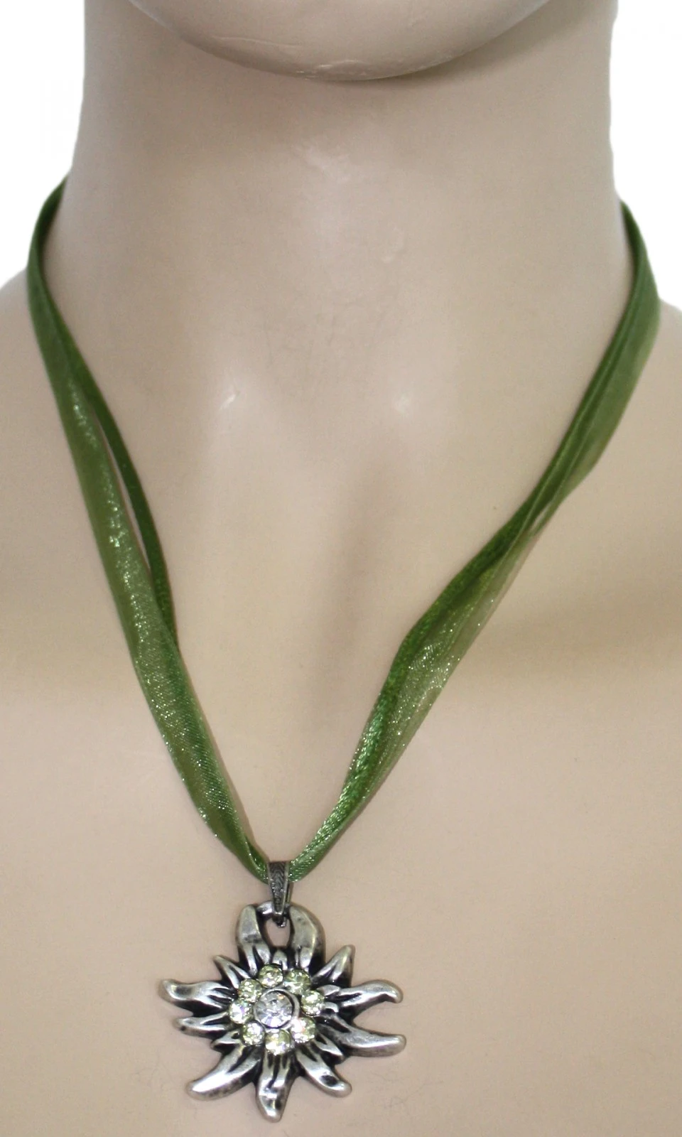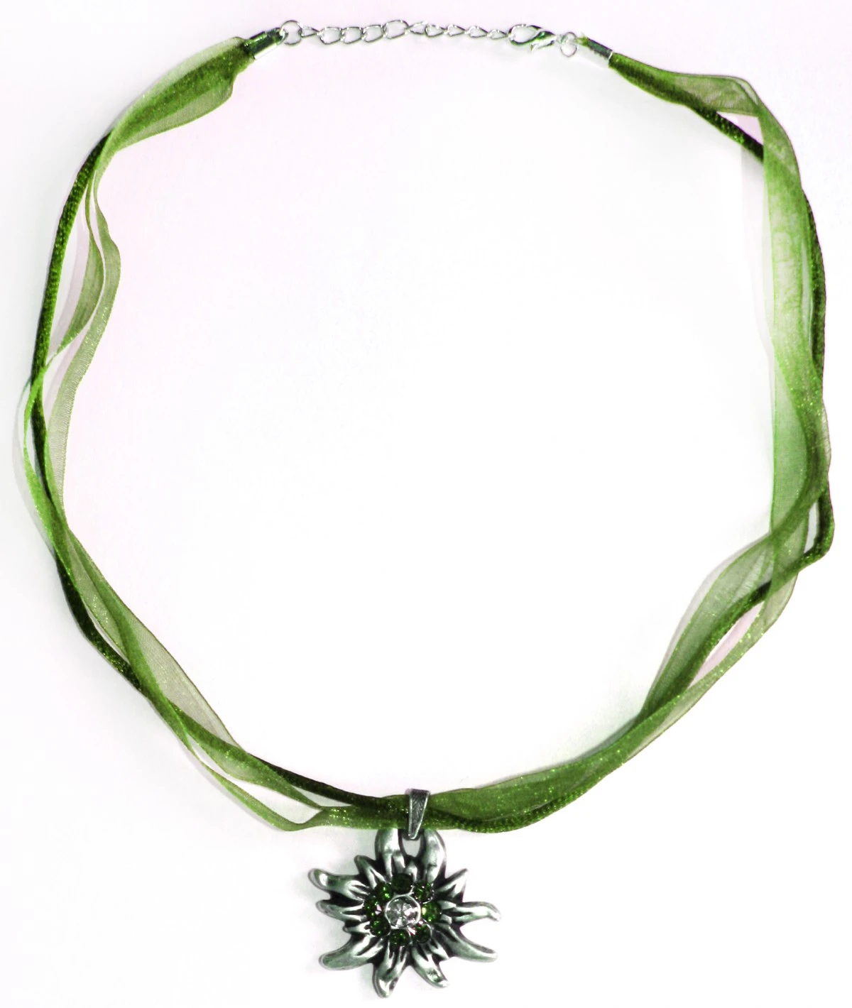 Trachtenkette aus Satin/Chiffon mit Strasssteinchen besetzem Edelweißanhänger