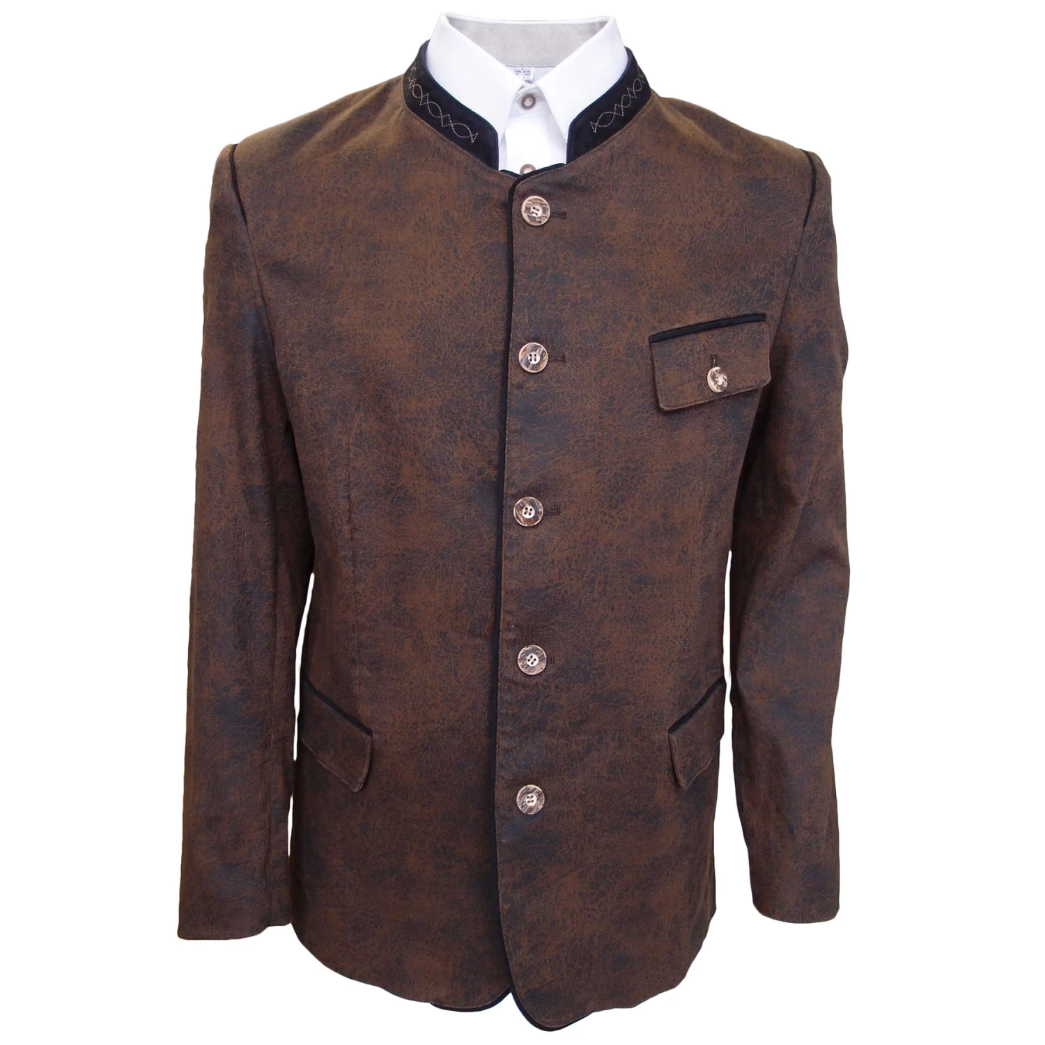 - An der Front wird er durchgehend mit Hirschhornimitat-Knöpfen geschlossen