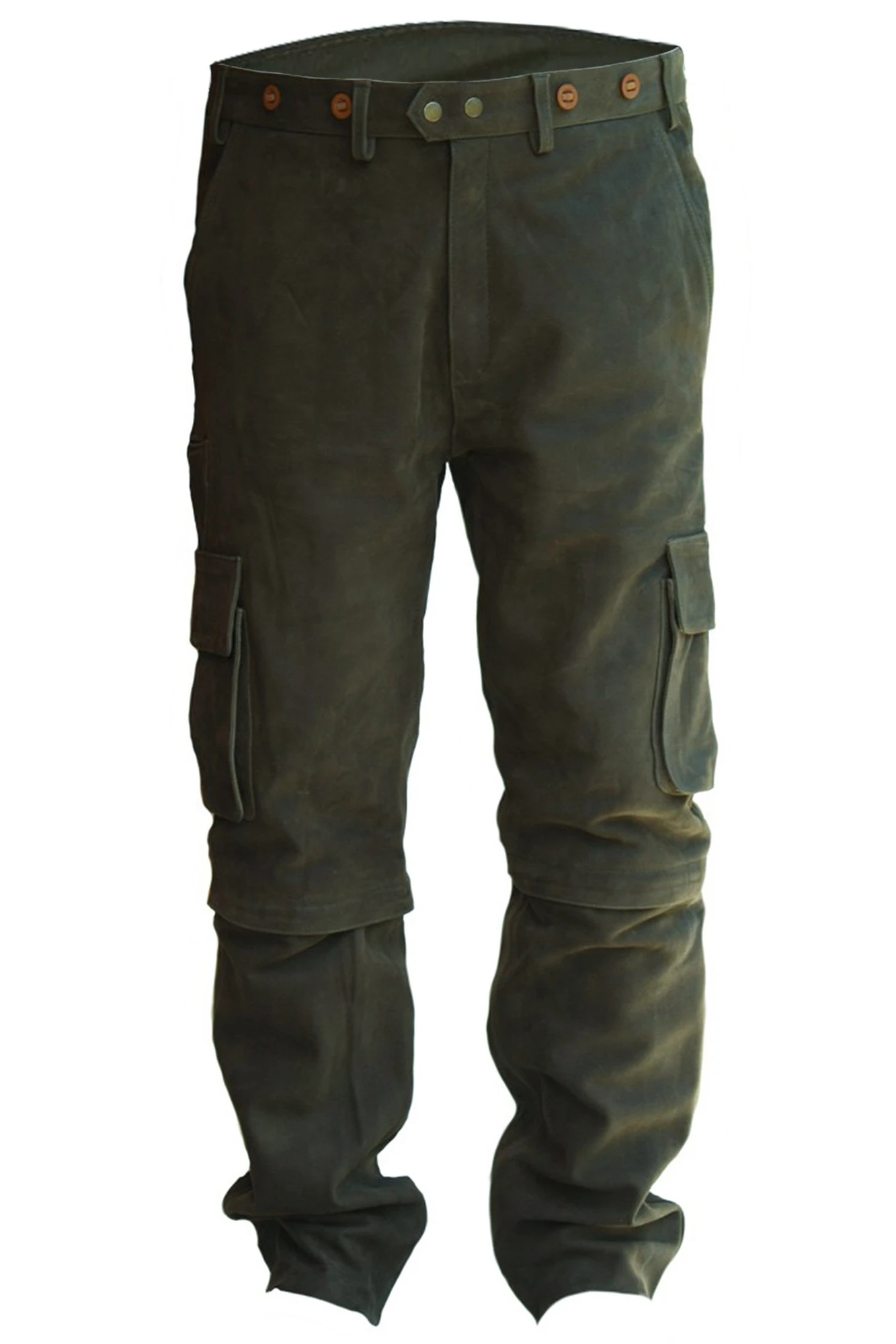 Lange 2in1 Lederhose aus weichem Büffelleder mit abnehmbaren unteren Hosenteilen, in der Farbe Jagdgrün