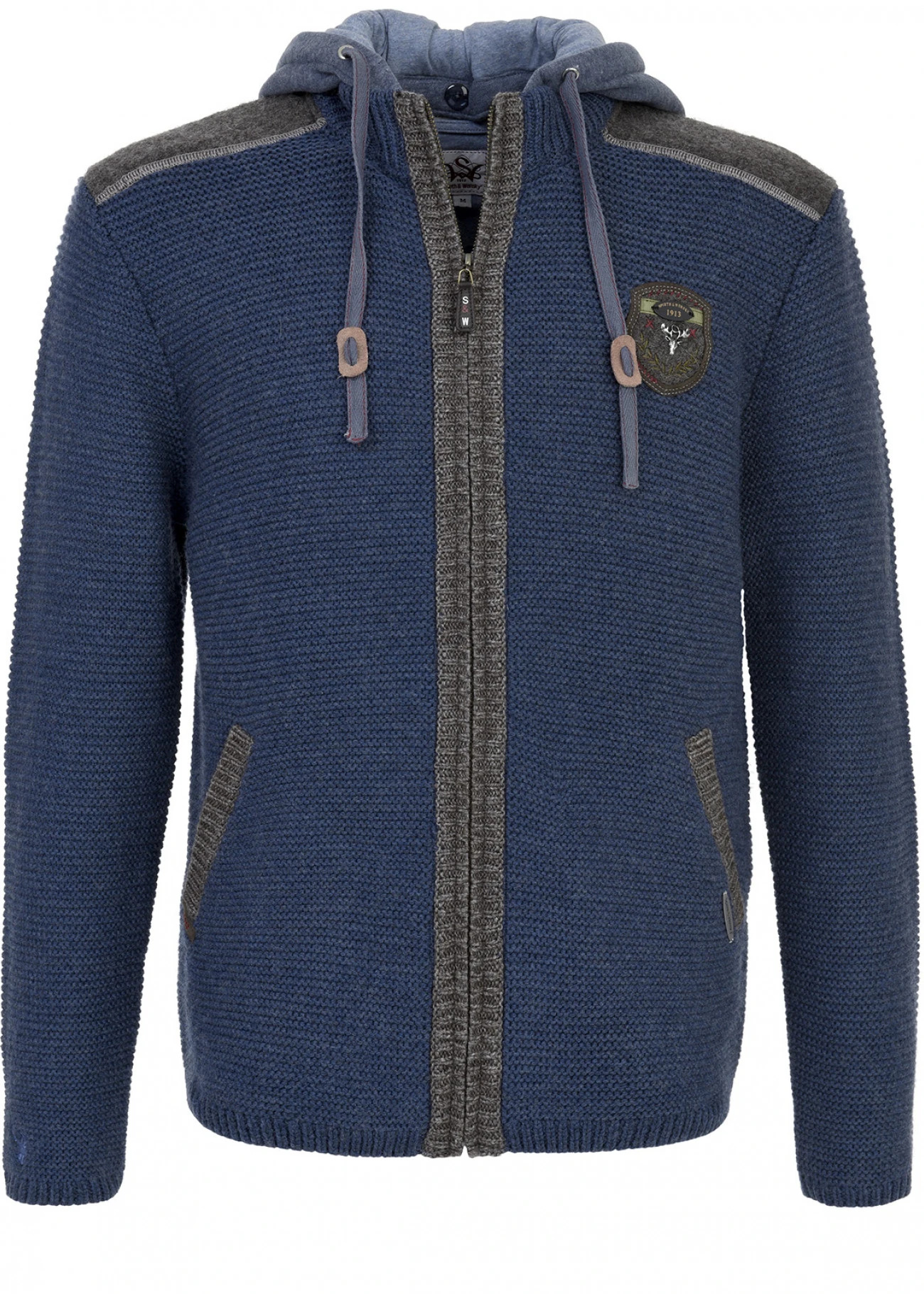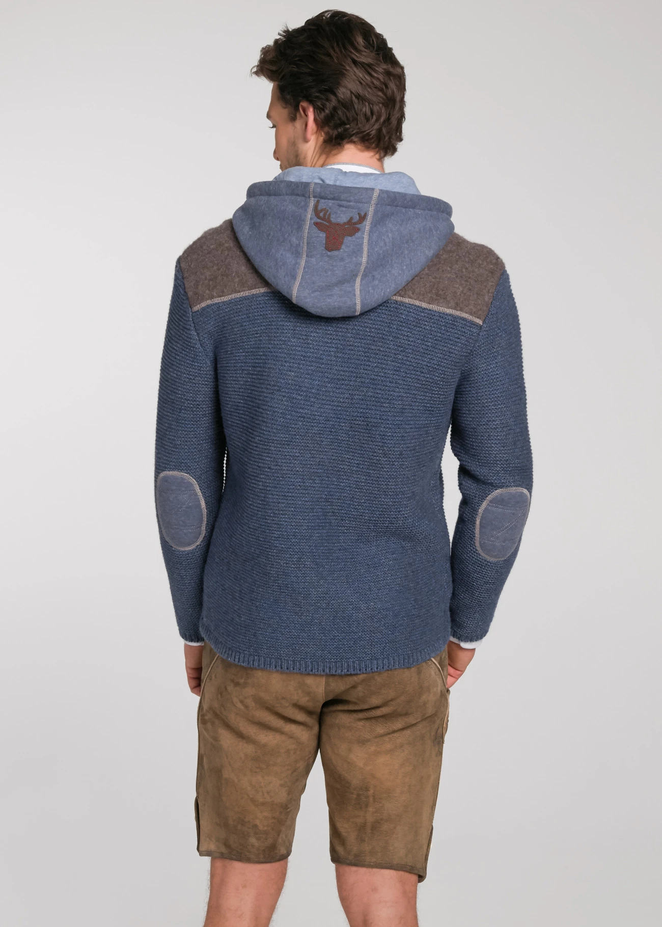 - Der Reißverschluss, die Taschen und die Ellenbogen-Patches setzen sich farblich ab und harmonieren zur Kapuze mit Hirsch-Motiv.